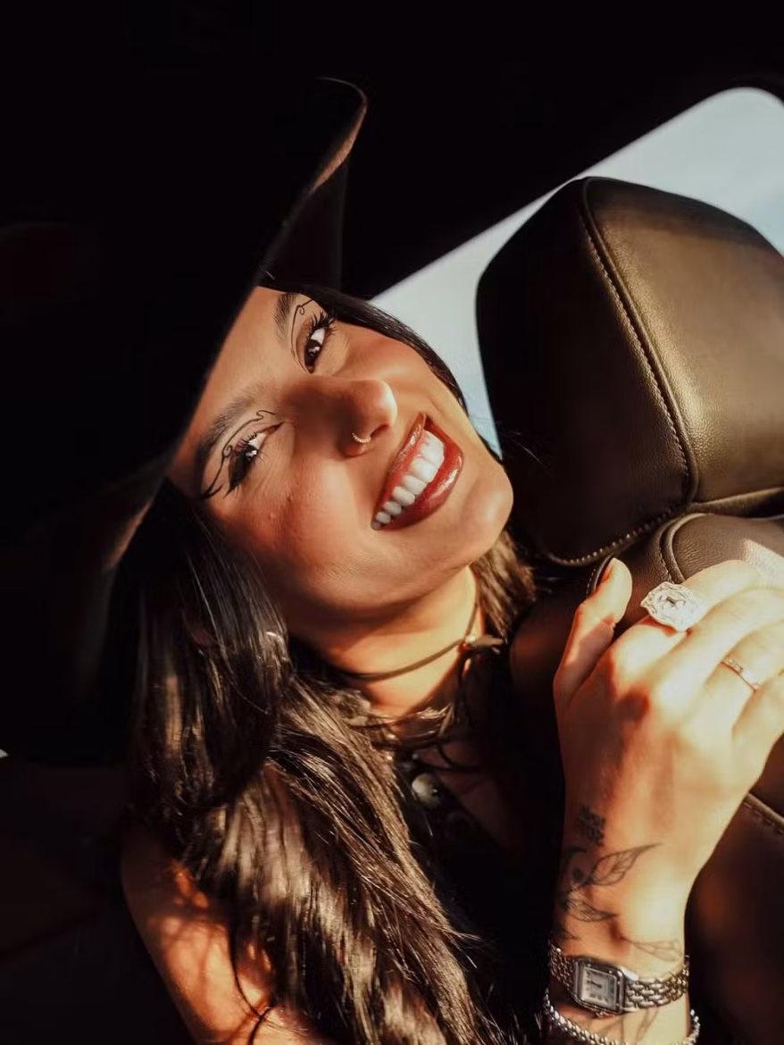 A artista publicou as imagens no seu perfil do Instagram. Nelas, vemos Castela usando um look composto por um colete e uma calça estampados com pequenos discos metalizados, salto alto preto, pulseiras e anéis prateados e seu clássico chapéu de cowboy em um tom escuro.
