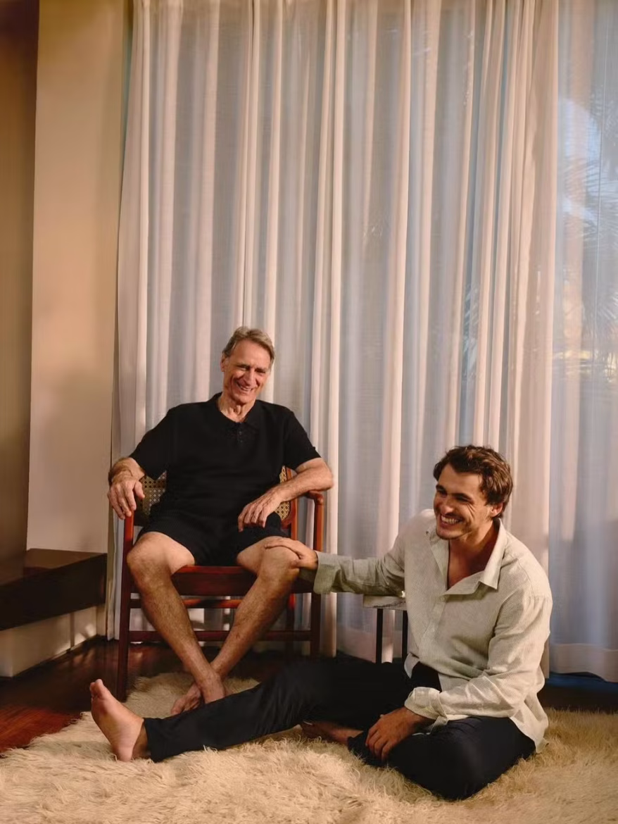 Na foto, vemos o ator de 74 anos sentado em uma cadeira e o filho no chão, com a mão na perna do pai. Na legenda da foto ele escreveu:
