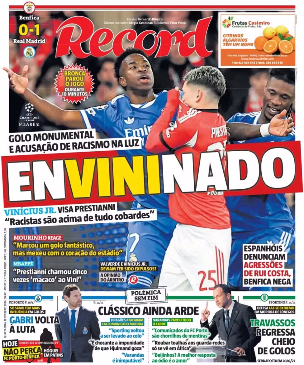 “Envininado” destaca o jornal Record, de Portugal: “Gol monumental e acusação de racismo”.