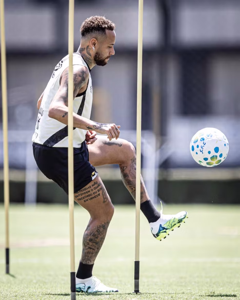 Neymar realizou nesta terça-feira pela manhã no Santos o primeiro trabalho com bola, sem contato físico com os outros companheiros, desde a cirurgia no joelho esquerdo.
