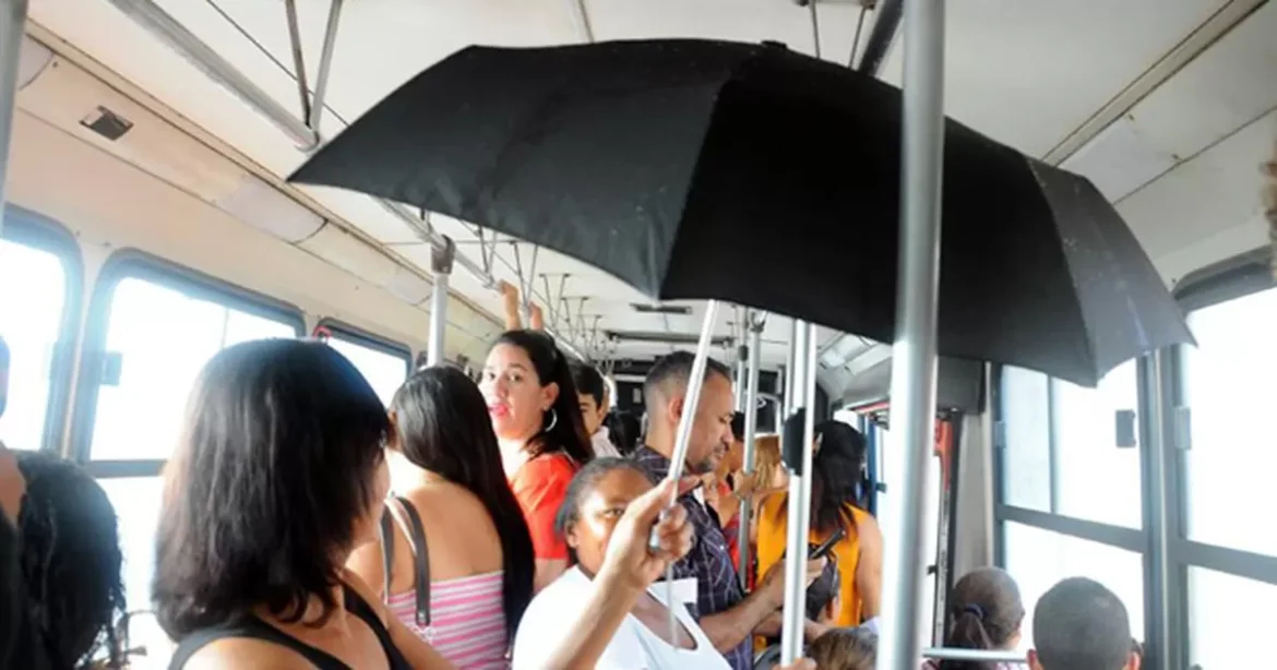No registro enviado por Juliana Maria Narcizo à EPTV, afiliada da TV Globo, é possível observar passageiros tentando se acomodar no coletivo já cheio, enquanto a mulher permanece sentada com o guarda-chuva aberto por conta do vazamento no teto do veículo.