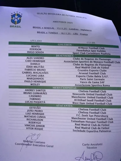 Esporte Com Fabinho e Vitor Roque e sem Neymar, Ancelotti faz última convocação de 2025; veja os nomes 03/11/2025
