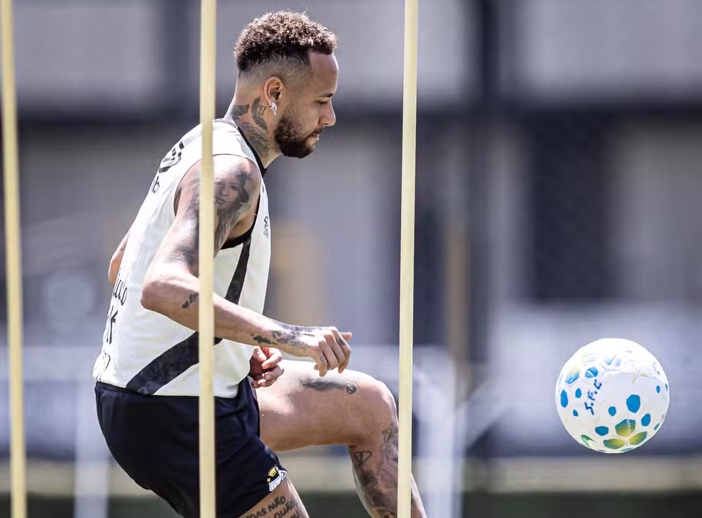 Neymar realizou nesta terça-feira pela manhã no Santos o primeiro trabalho com bola, sem contato físico com os outros companheiros, desde a cirurgia no joelho esquerdo.