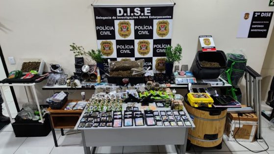 Os investigadores também recolheram câmeras de vídeo, balanças de precisão, máscaras de proteção, fertilizantes, luvas, etiquetas, baldes, ferramentas, rádio transmissor, máquina de cartão, cadernos com anotações sobre o tráfico, tablet e o total de 13 celulares. Além disso, no quarto da principal investigada, a equipe apreendeu uma arma municiada.