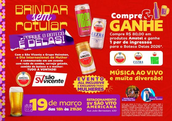 Na quinta-feira, 19 de março, os Supermercados São Vicente, em parceria com o Grupo HEINEKEN, promovem gratuitamente um happy hour exclusivo para mulheres, com degustação à vontade das cervejas puro malte Amstel e Amstel Ultra, versão sem glúten e de baixa caloria, além do ready-to-drink Amstel Vibes, acompanhadas por diversos tipos de petiscos.